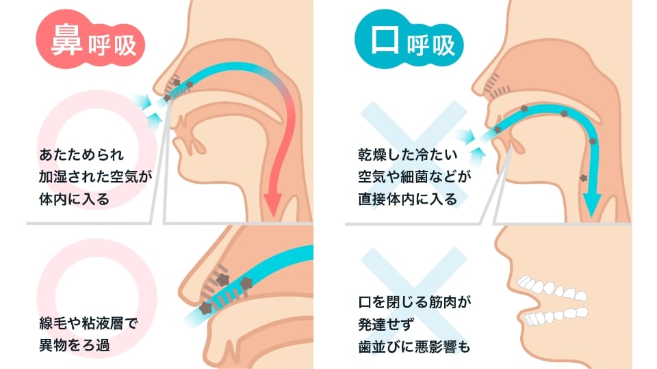 一方、口呼吸では、鼻呼吸による吸気の湿度の適正化や、鼻腔内の毛による不純物の除去が行われないため、喉や肺に負担がかかり、ウイルスによる感染症のリスクも高まります。